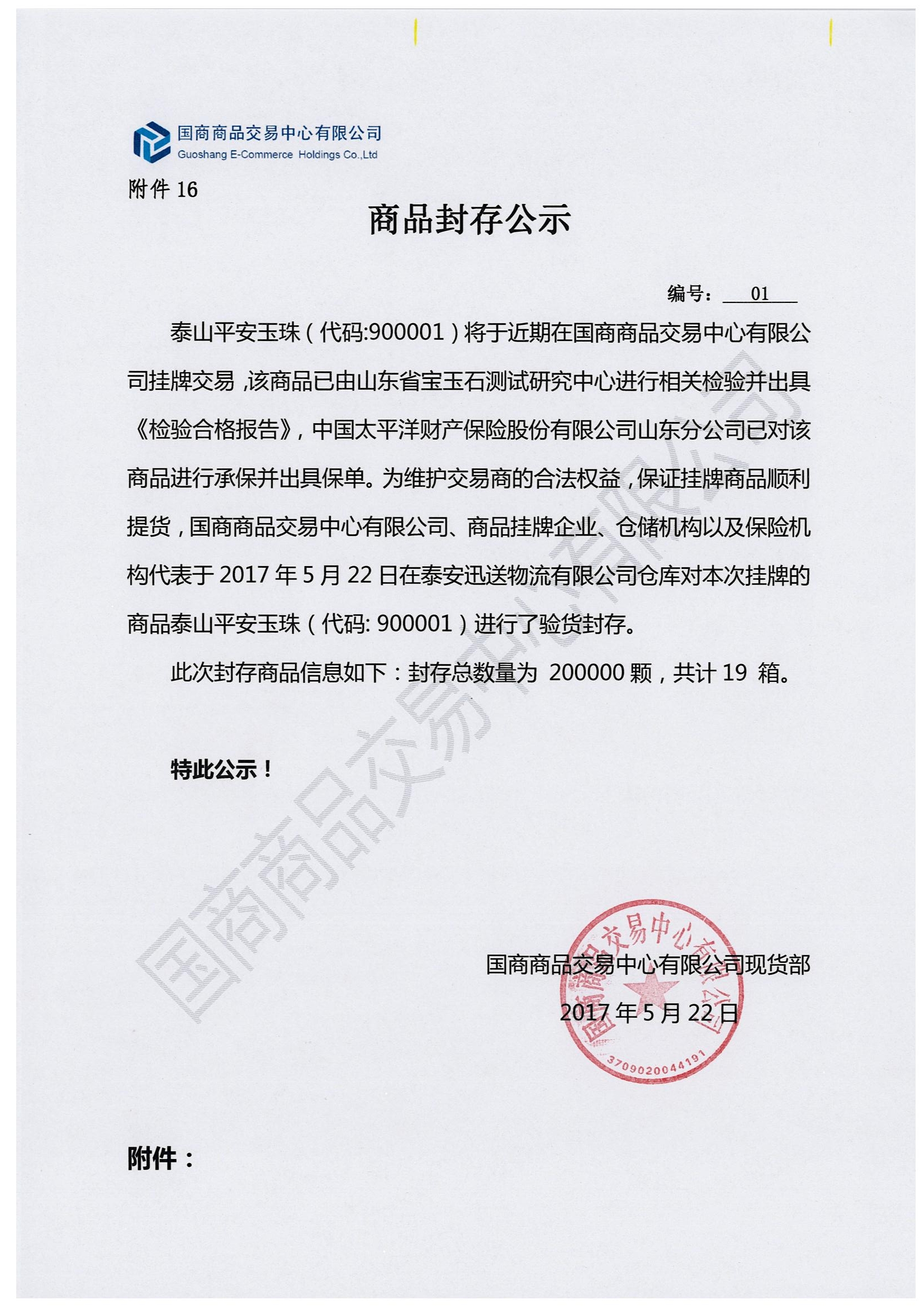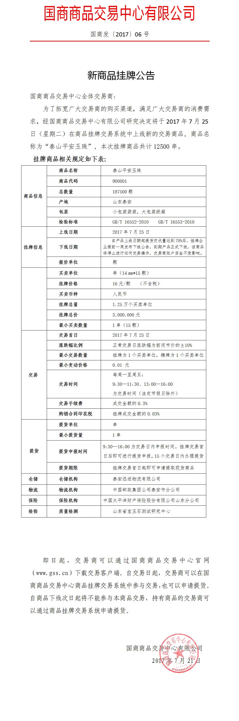 | 商品信息 | 拟挂牌商品 | 泰山平安玉珠 | 拟挂牌总量 | 1.25万串 |