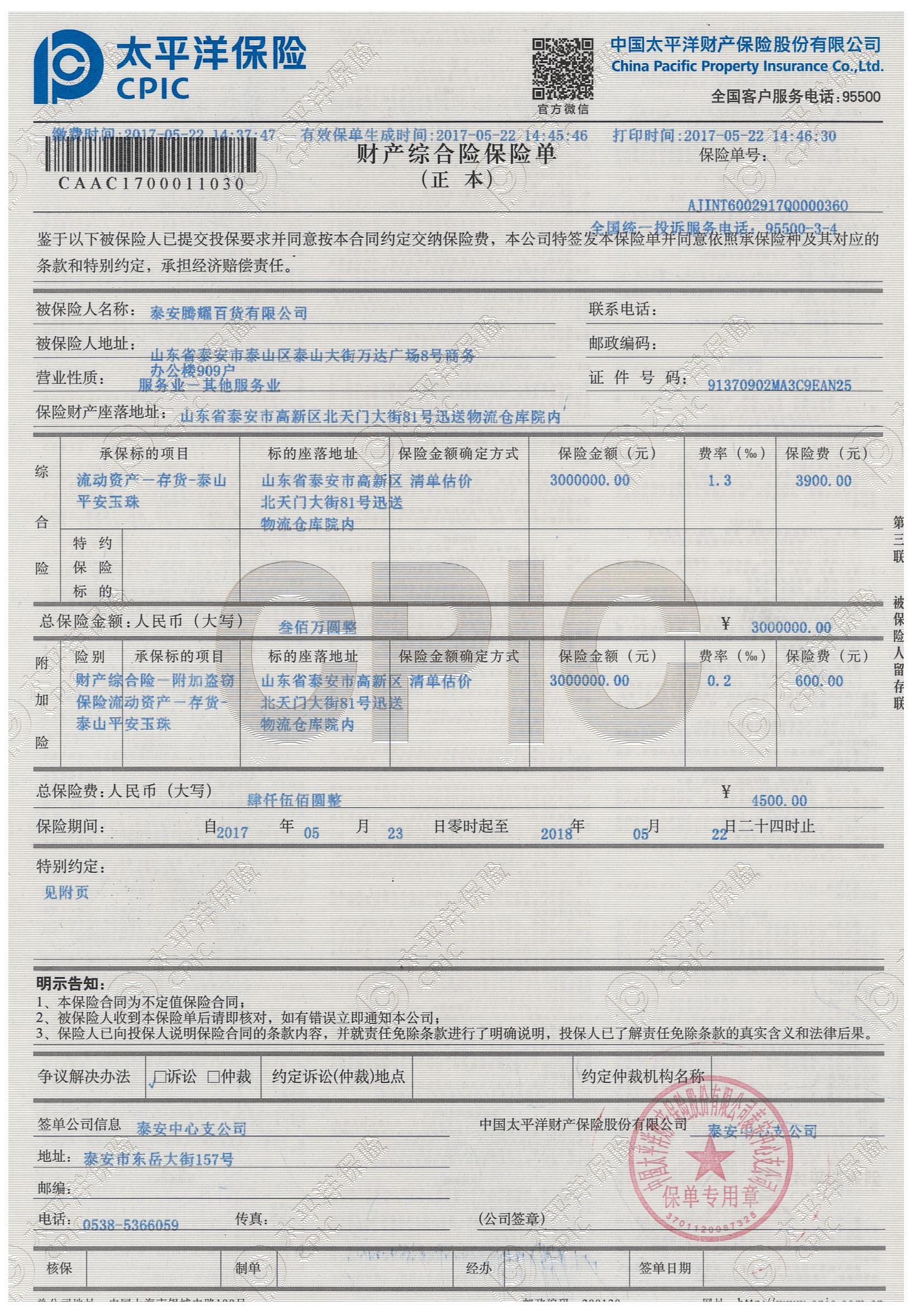 | 保险机构 | 中国太平洋财产保险股份有限公司山东分公司 | |||