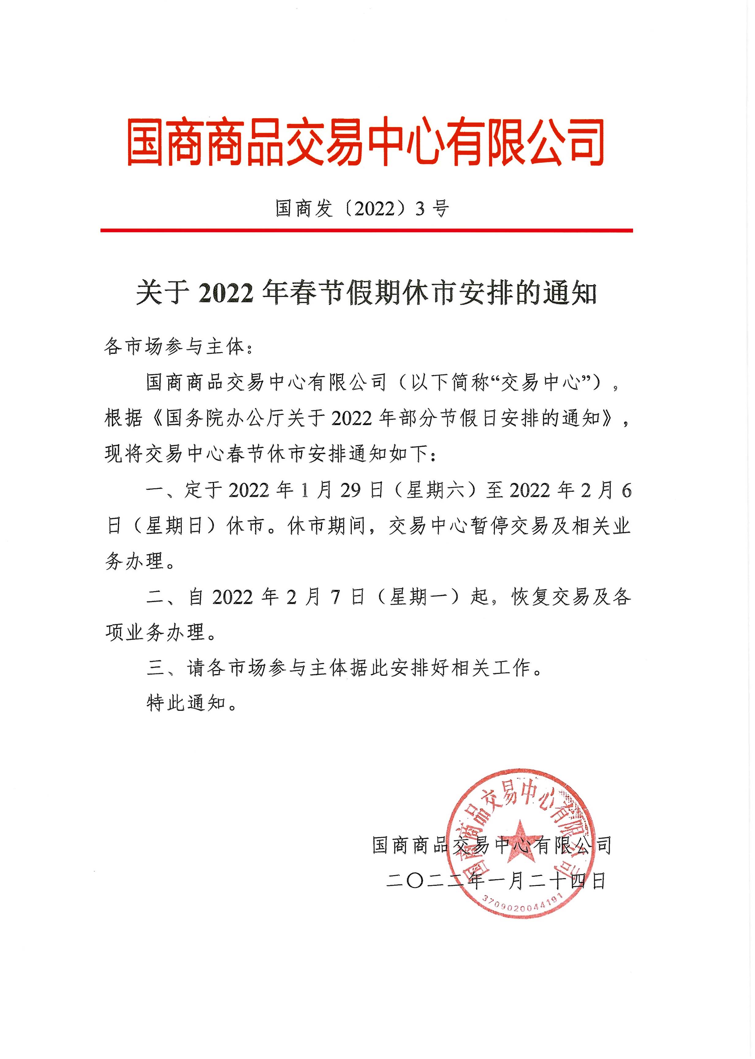 关于2022年春节休市安排的通知