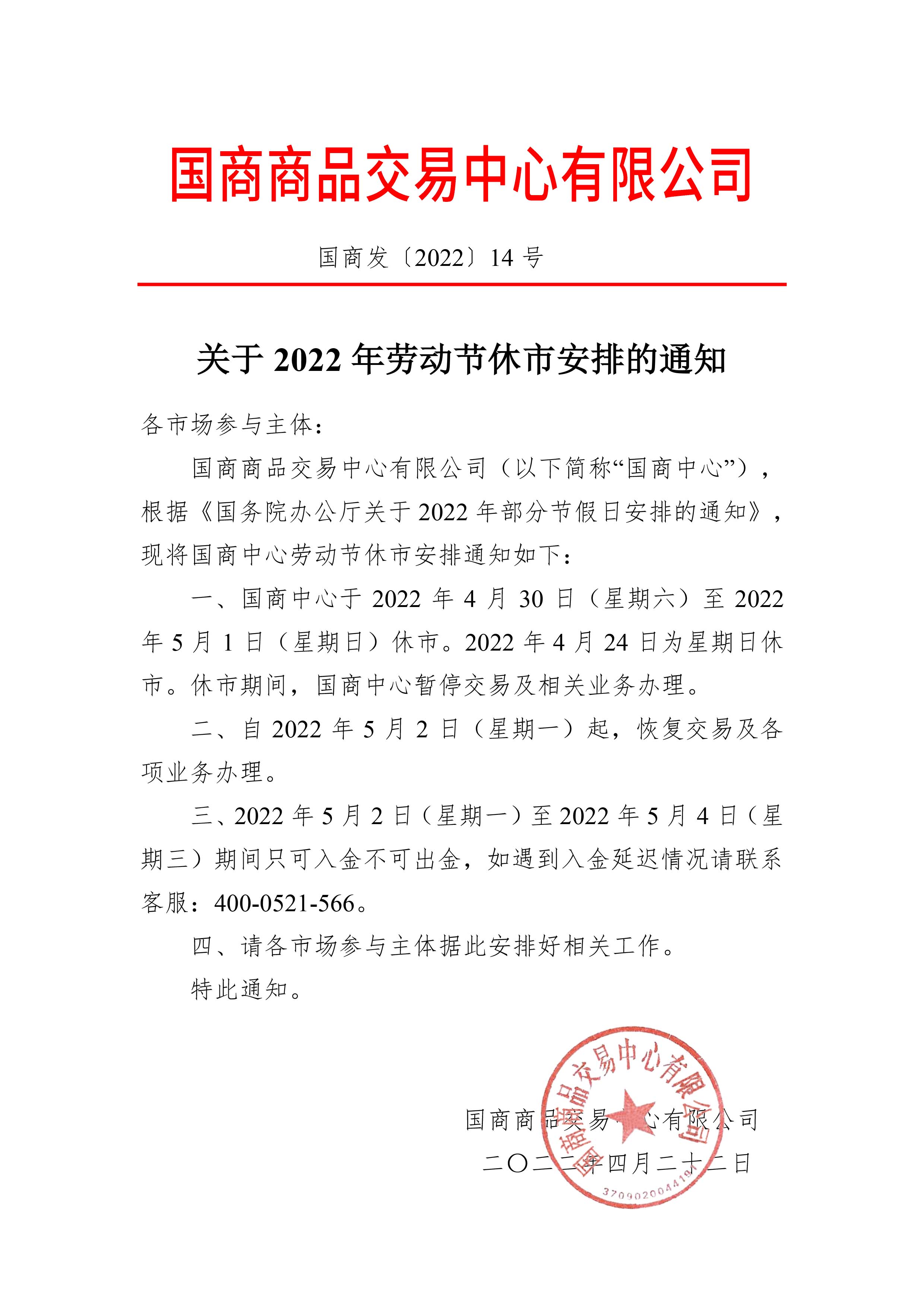 关于2022年劳动节休市安排的通知