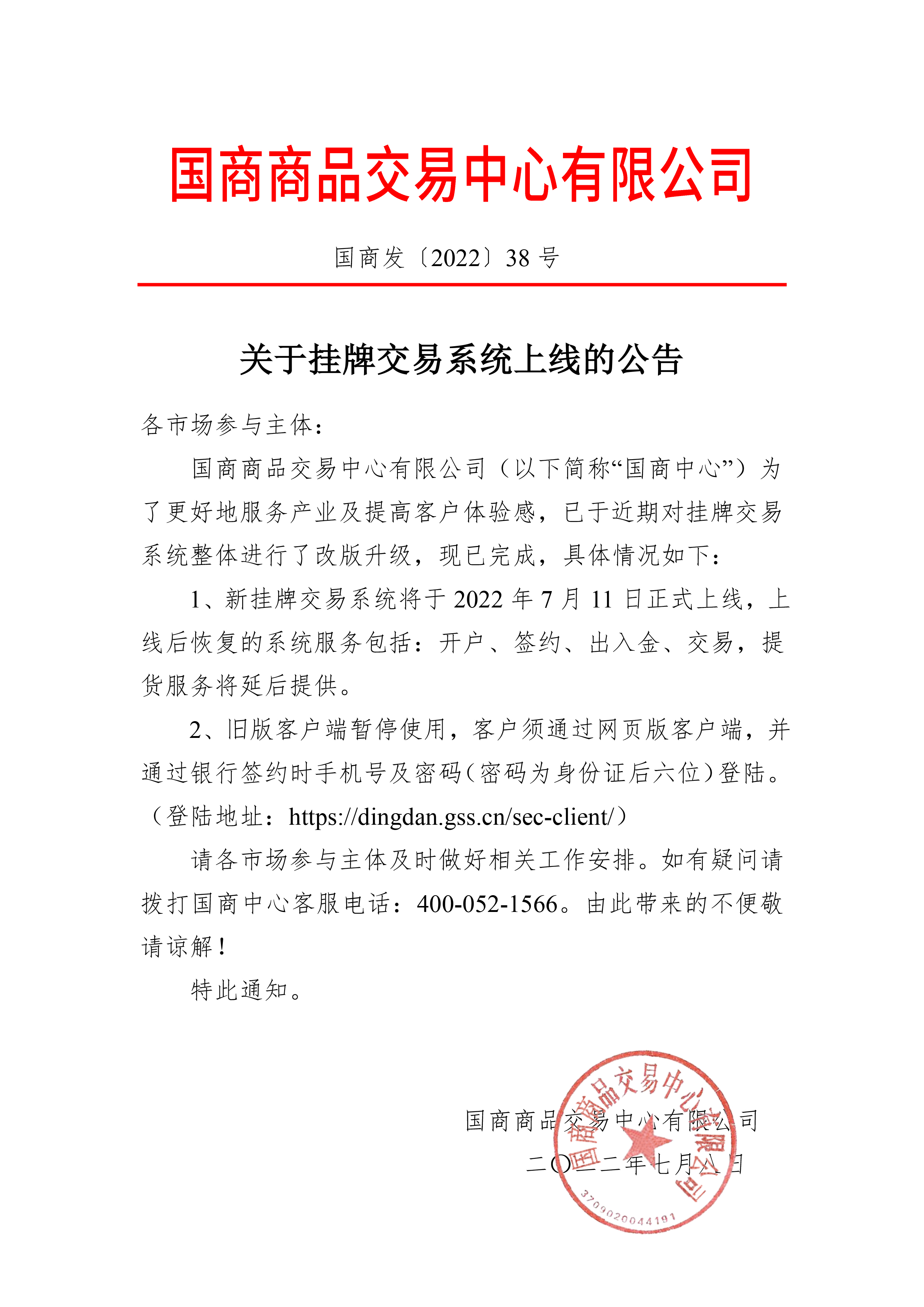 关于挂牌交易系统上线的公告