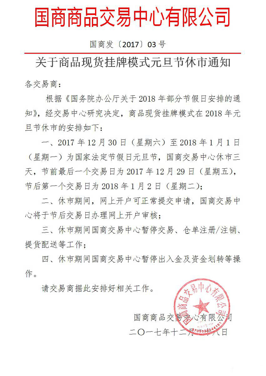 关于商品现货挂牌模式元旦节休市通知