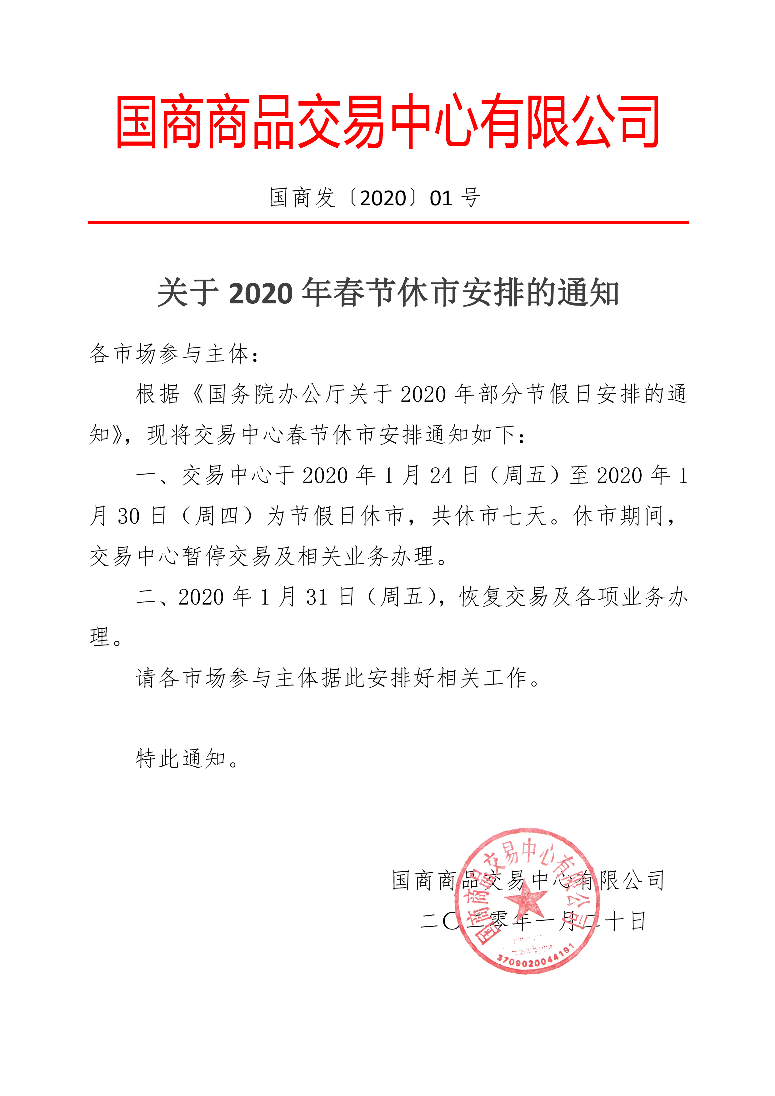 关于2020年元旦休市安排的通知
