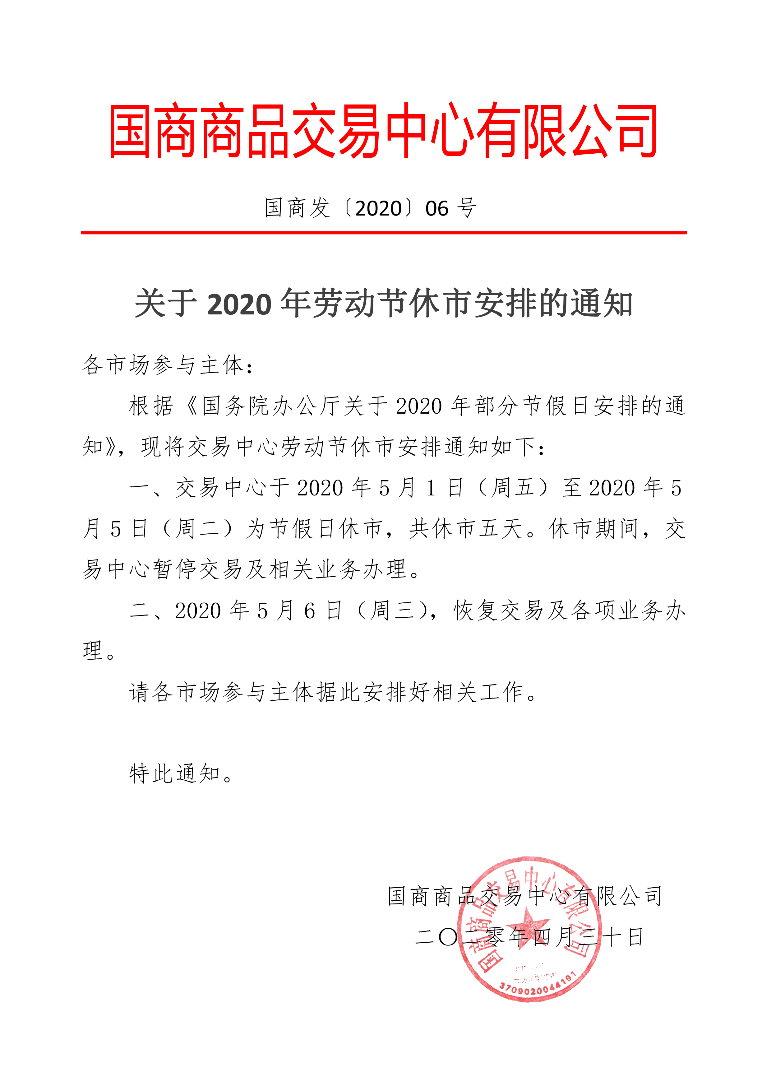 关于2020年劳动节休市安排的通知
