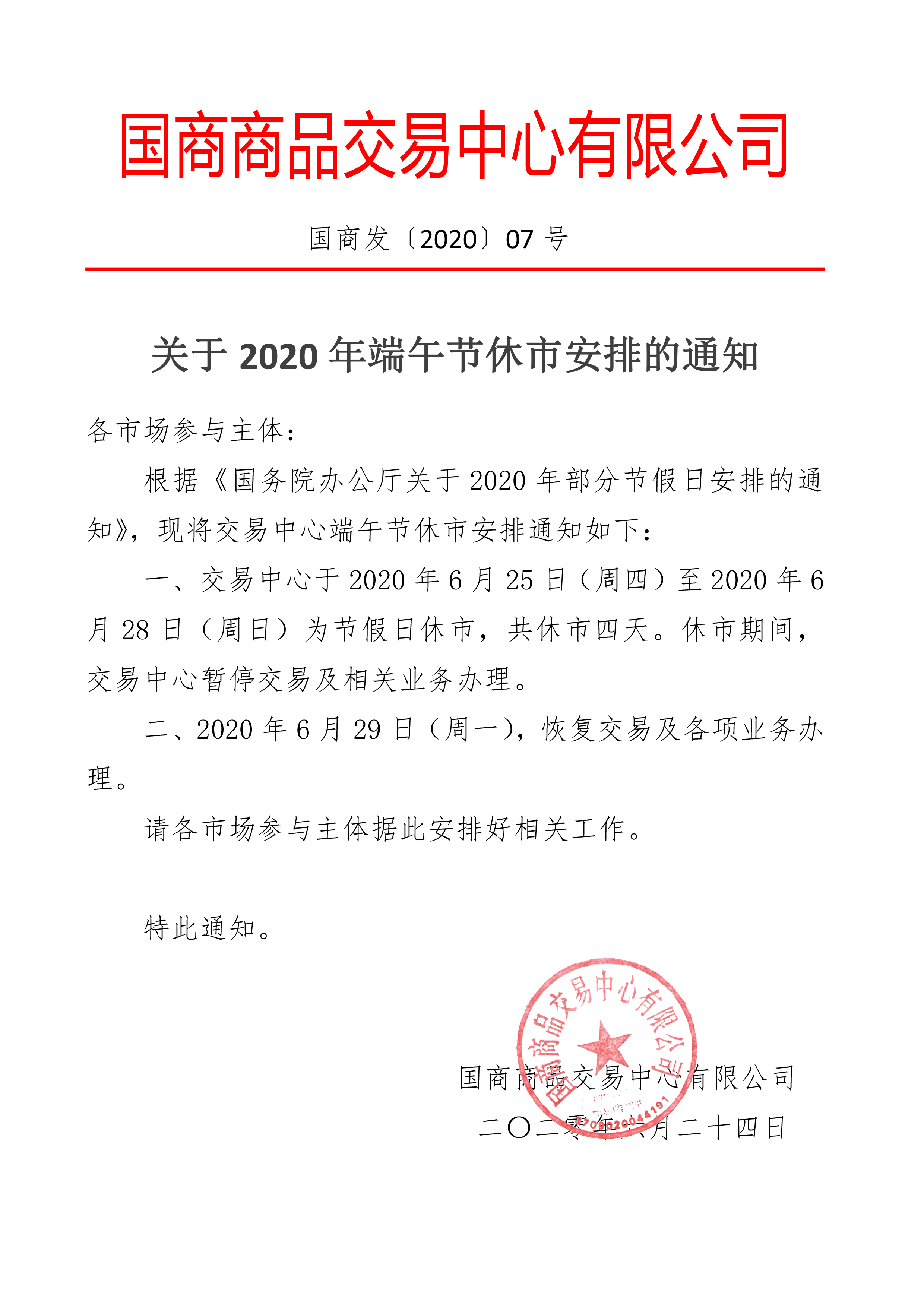 关于2020年端午节休市安排的的通知