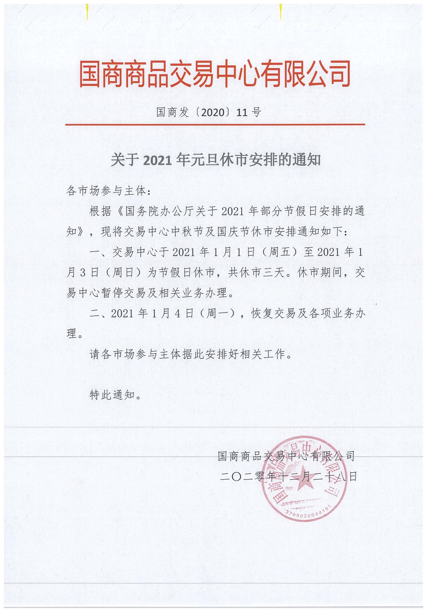 关于2021年元旦休市安排的通知