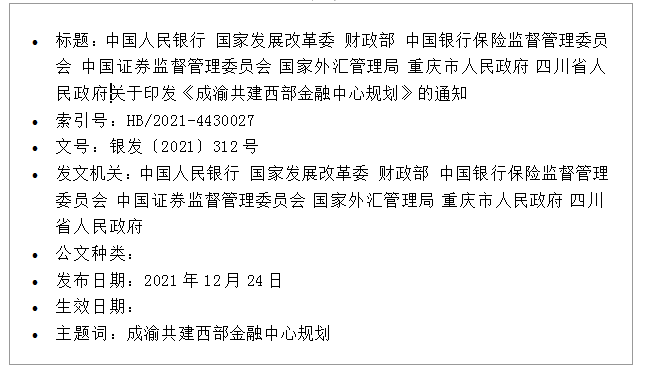 2021年12月24日,据中国人民银行官方信息披露显示,中国人民银行、中国证监会等部委联合印发《成渝共建西部金融中心规划》,其中提到探索建设西部数据资产交易场所,支持非居民参与大宗商品等内容,涉及各类要素交易场所,具体内容如下: