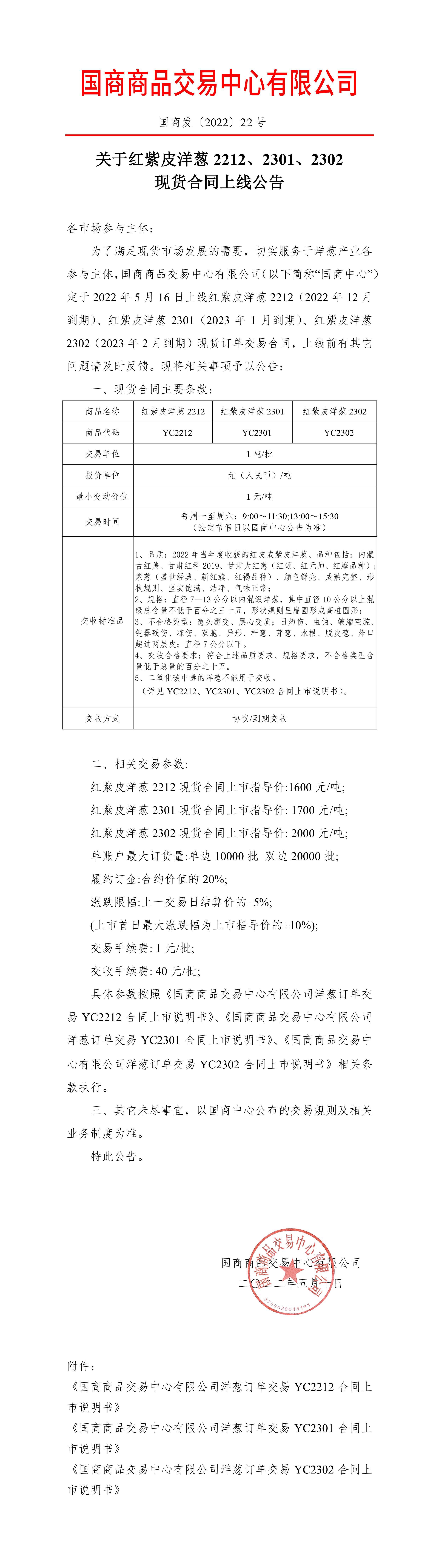http://www.gss.cn/gs/order/pin/2022/0510/1329.html附件:《国商商品交易中心有限公司洋葱订单交易YC2301合同上市说明书》