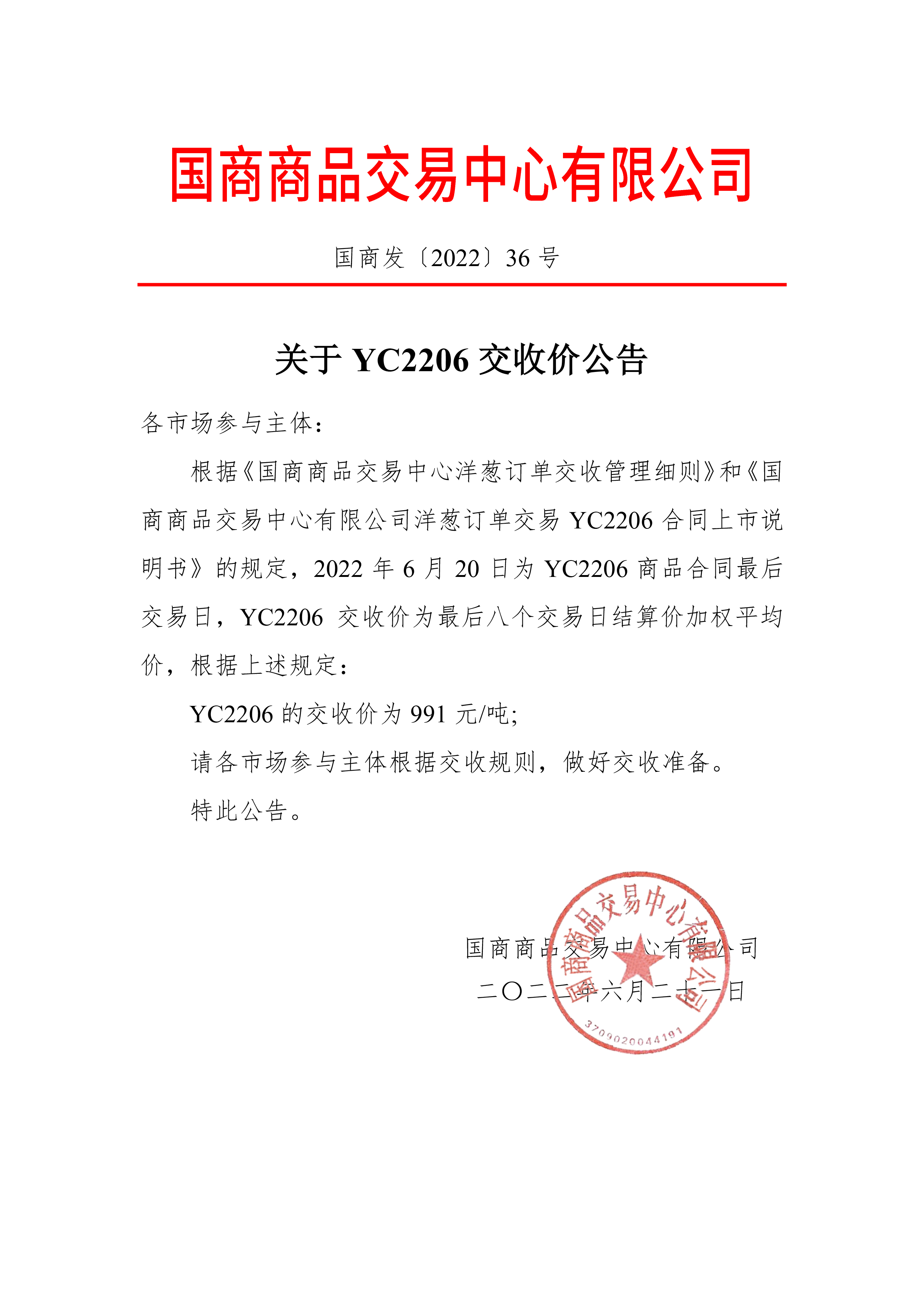 关于YC2206交收价公告