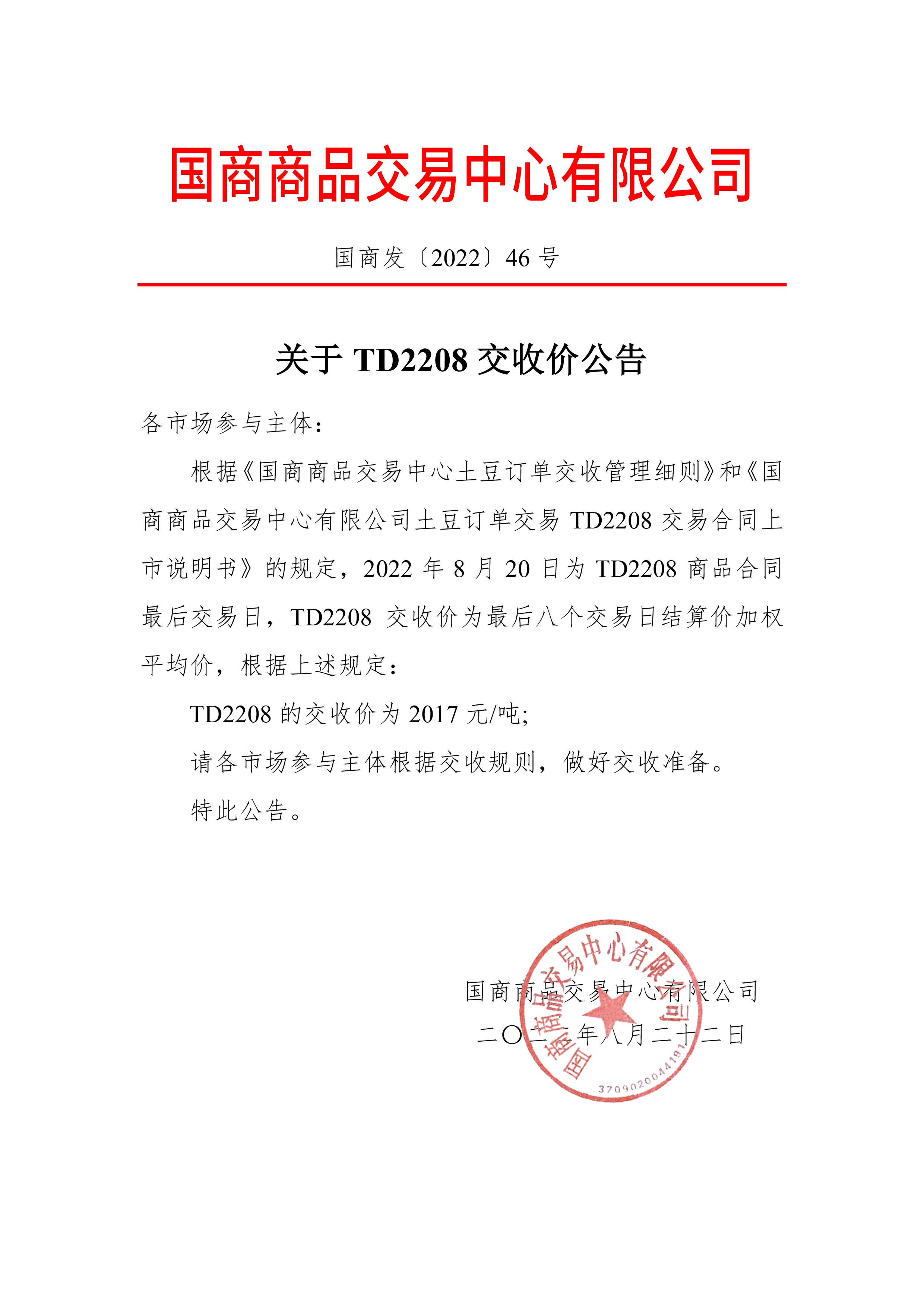 关于TD2208交收价公告
