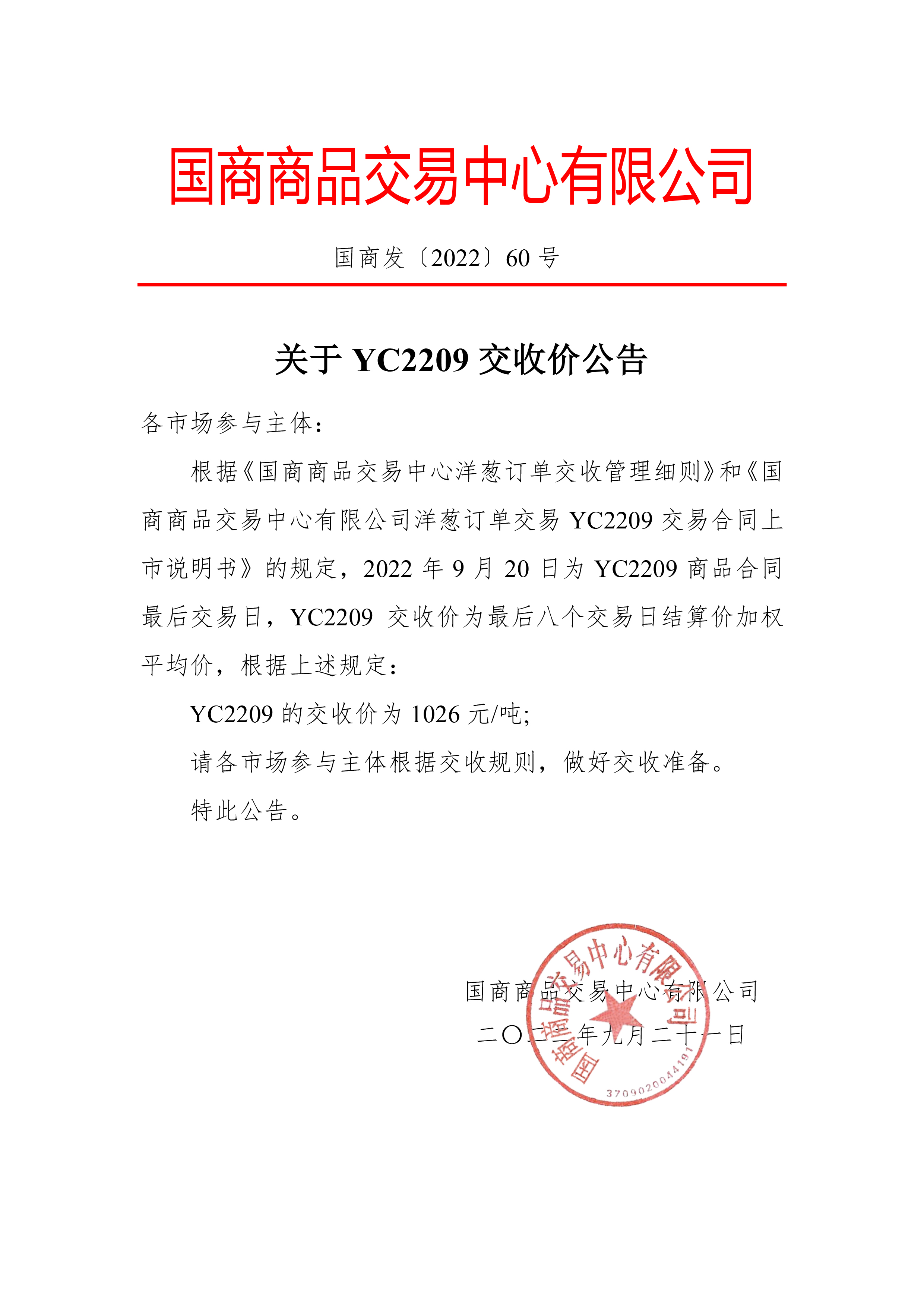 关于YC2209交收价公告