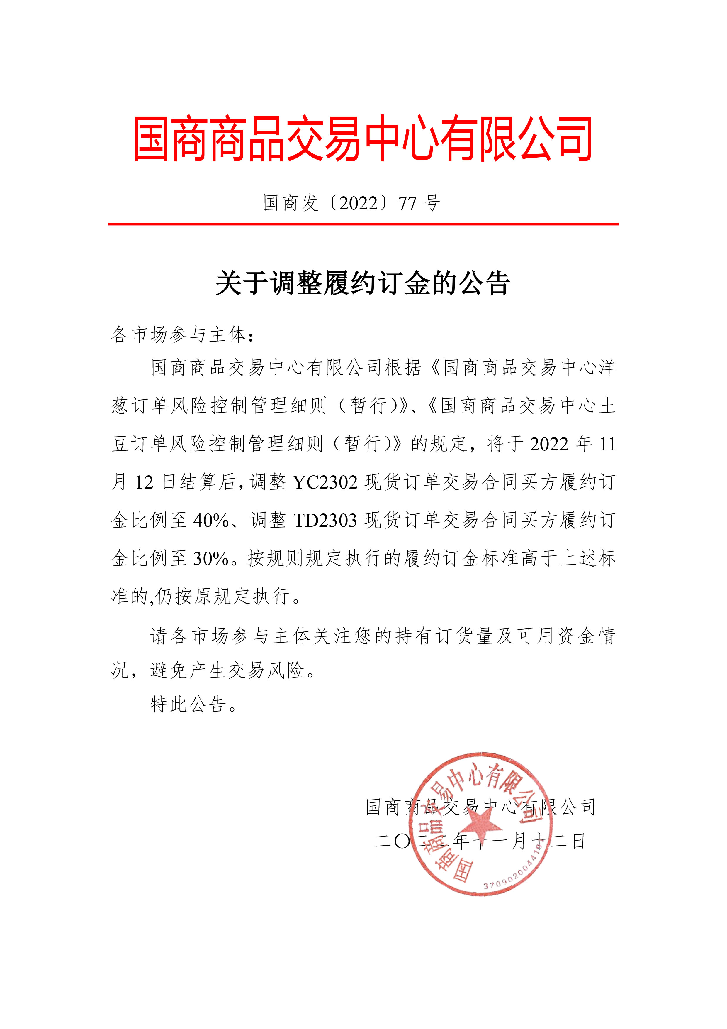 关于调整履约订金的公告