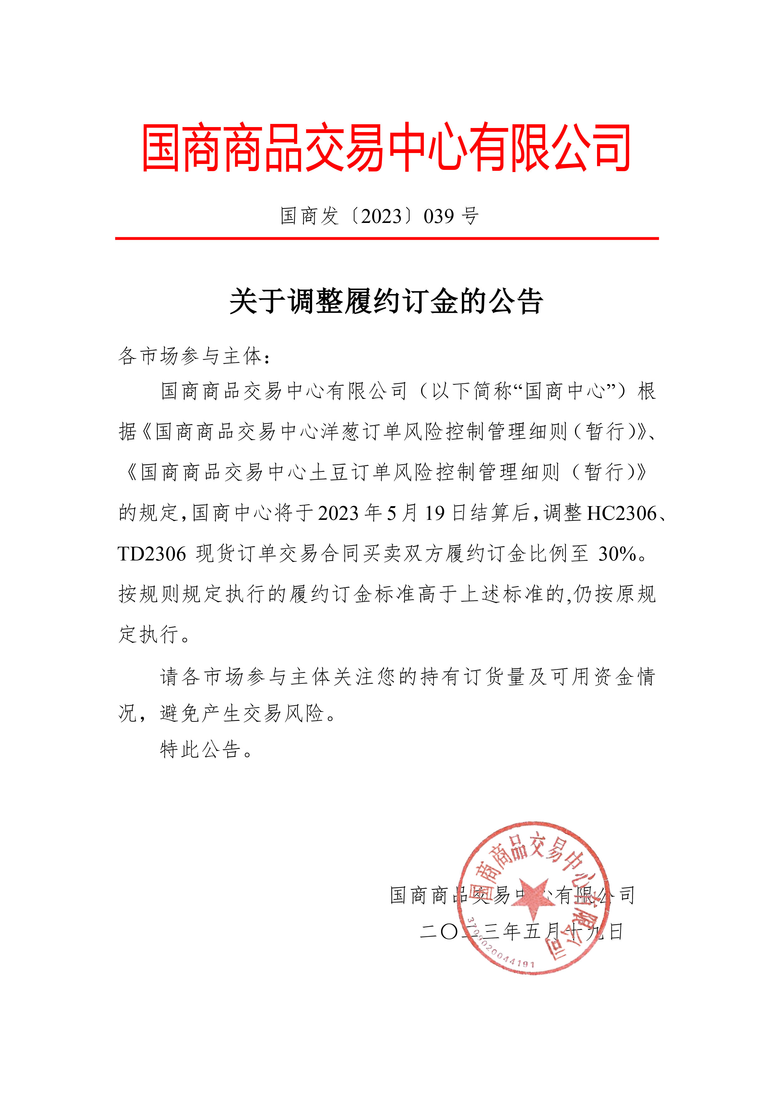 关于调整履约订金的公告