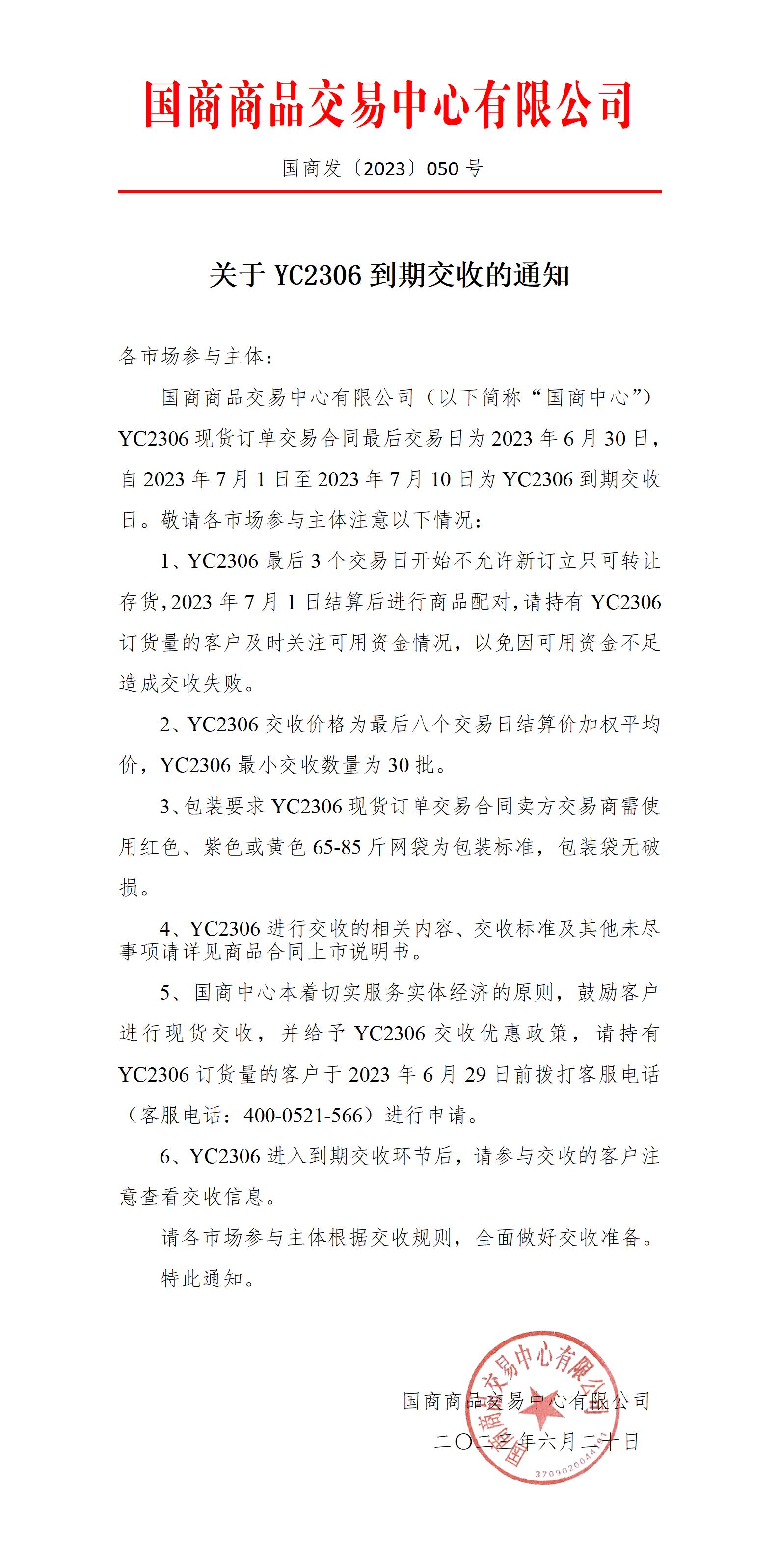 关于YC2306到期交收的通知