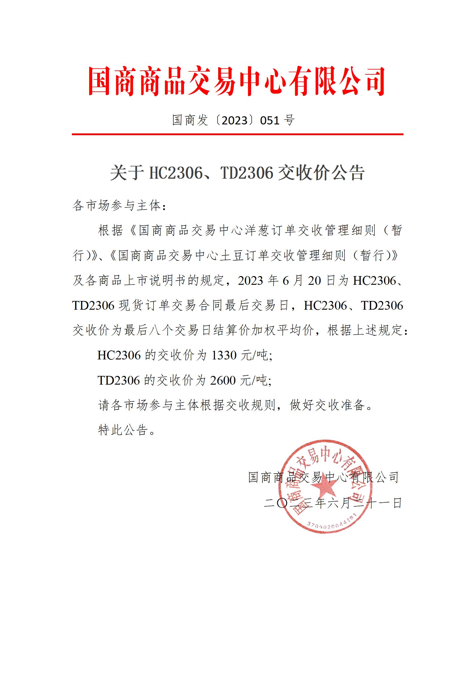 关于HC2306、TD2306交收价公告