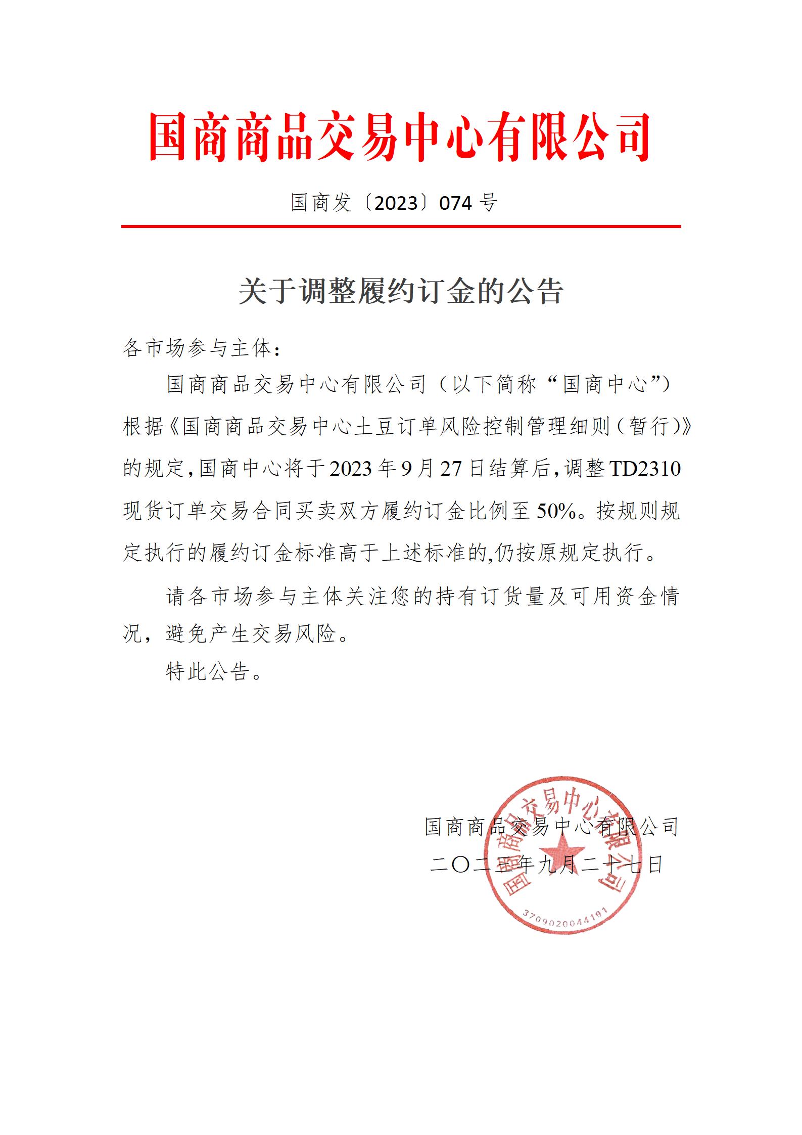 关于YC2309交收价公告