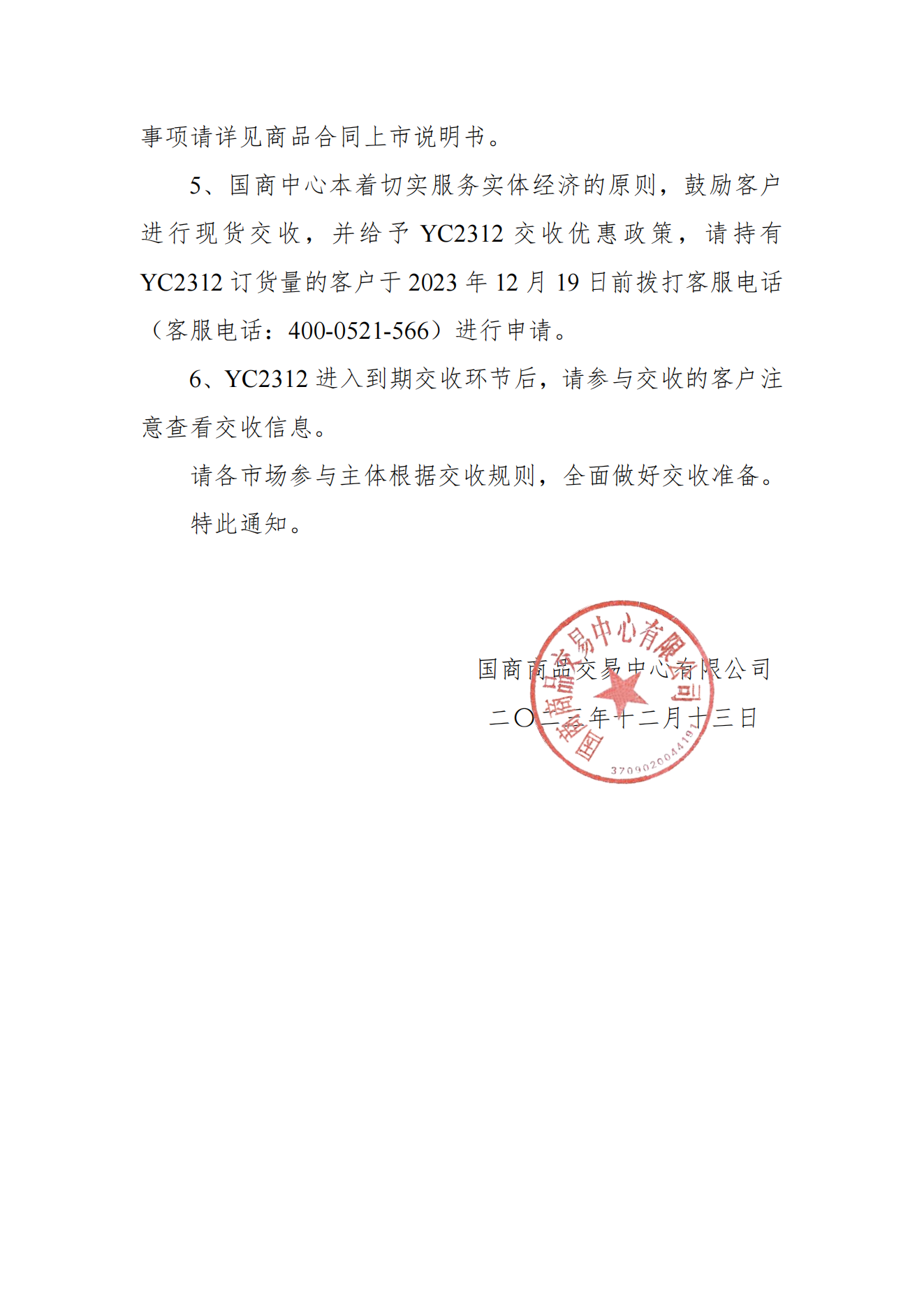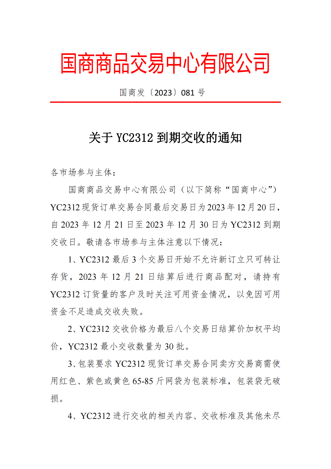 关于YC2312交收价公告