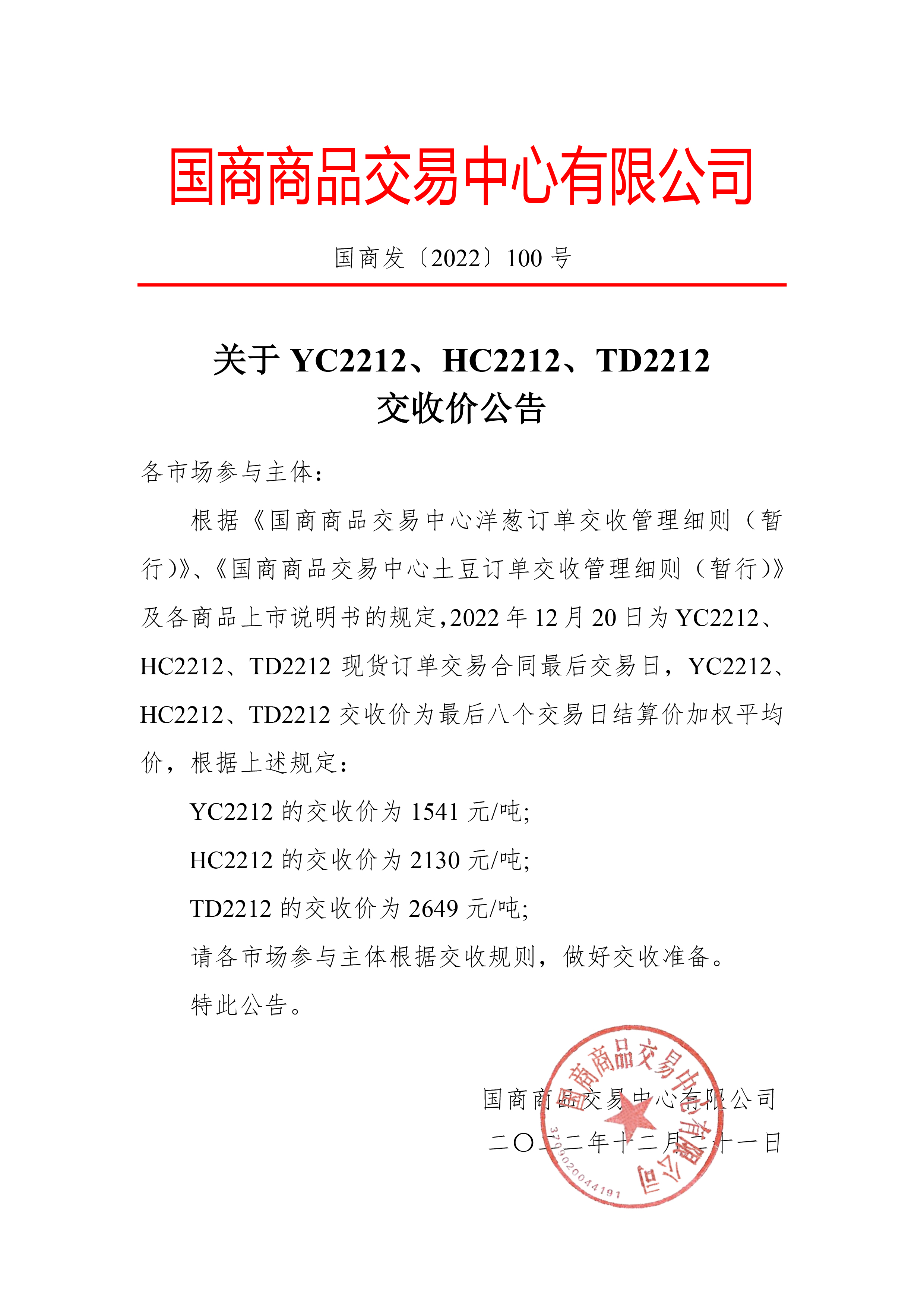 关于YC2212、HC2212、TD2212 交收价公告 2022-12-21