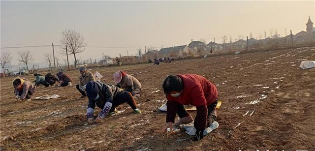 这两天,天气回暖,春光正好,在凤翔区南指挥镇河南屯村洋葱种植基地,20多名工人趁着好天气娴熟地起垄、覆膜、定位、移栽,一排排洋葱苗整齐地扎根在地垄里,田间地头一片繁忙的景象。