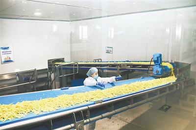 走进雪川农业薯条加工车间,薯香浓郁,个头匀称的土豆翻滚而出进入传送设备,清洗、切条、裹粉、冷冻,一根根泛着金黄的薯条从这里走向全国。