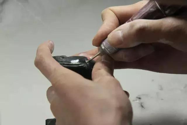 用纱条进行沾水研磨,直到看不见雕刻的痕迹,再用极细的研磨条进行研磨。