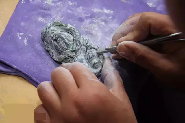 先将大块玉石切割出大概的形状,在进行细节的纯手工雕刻。